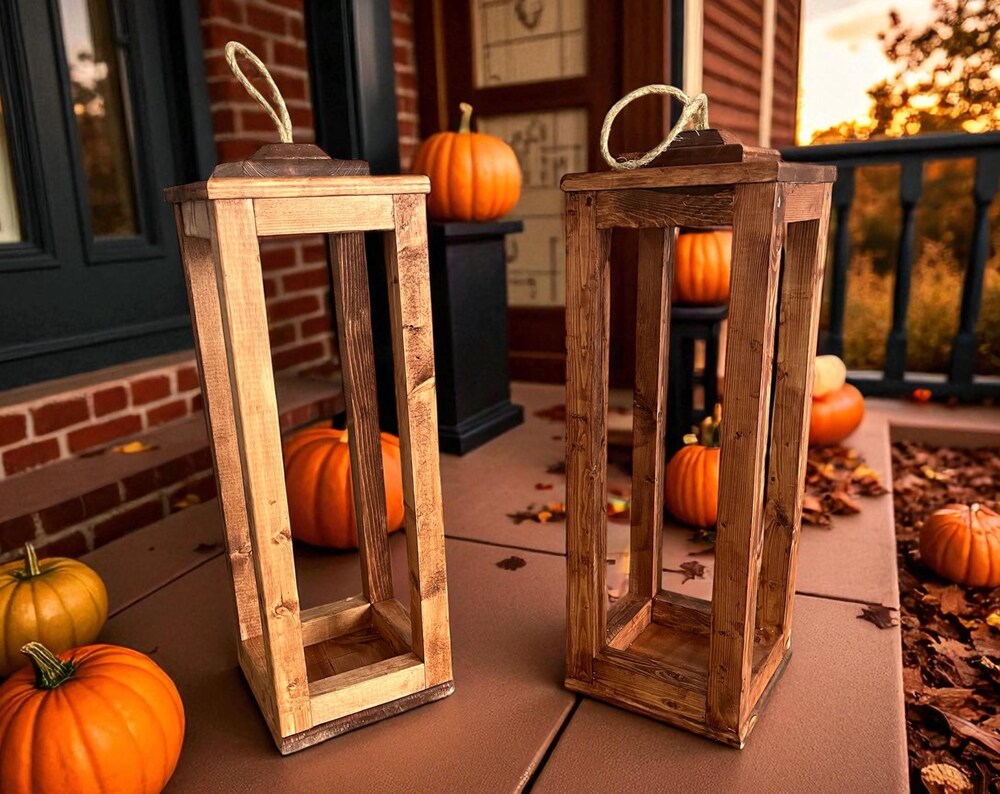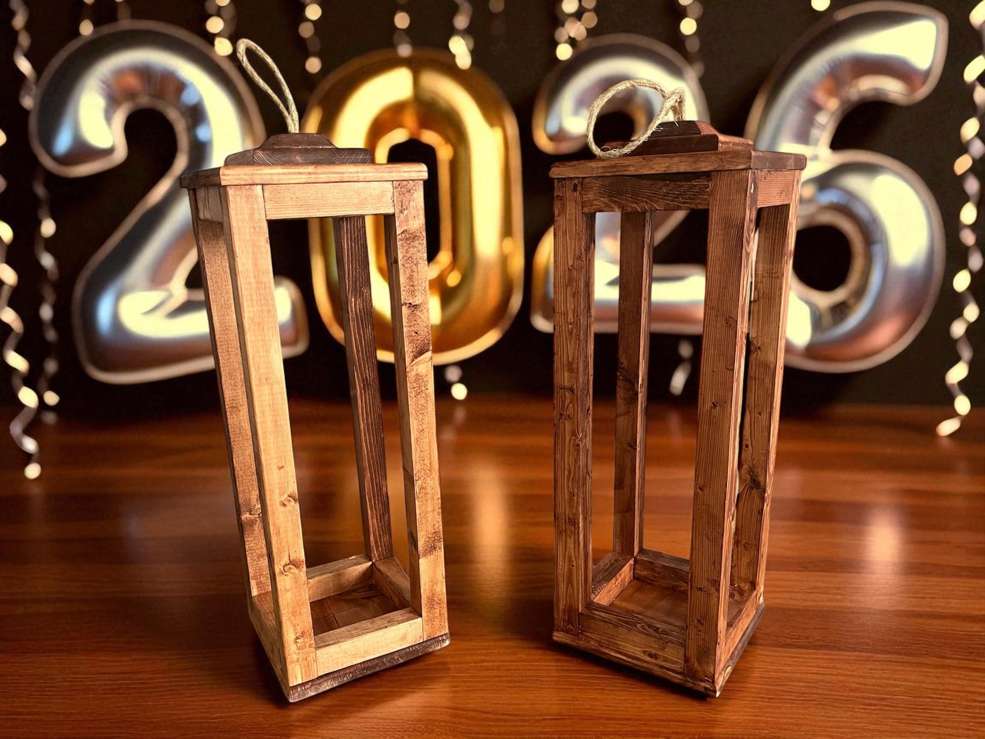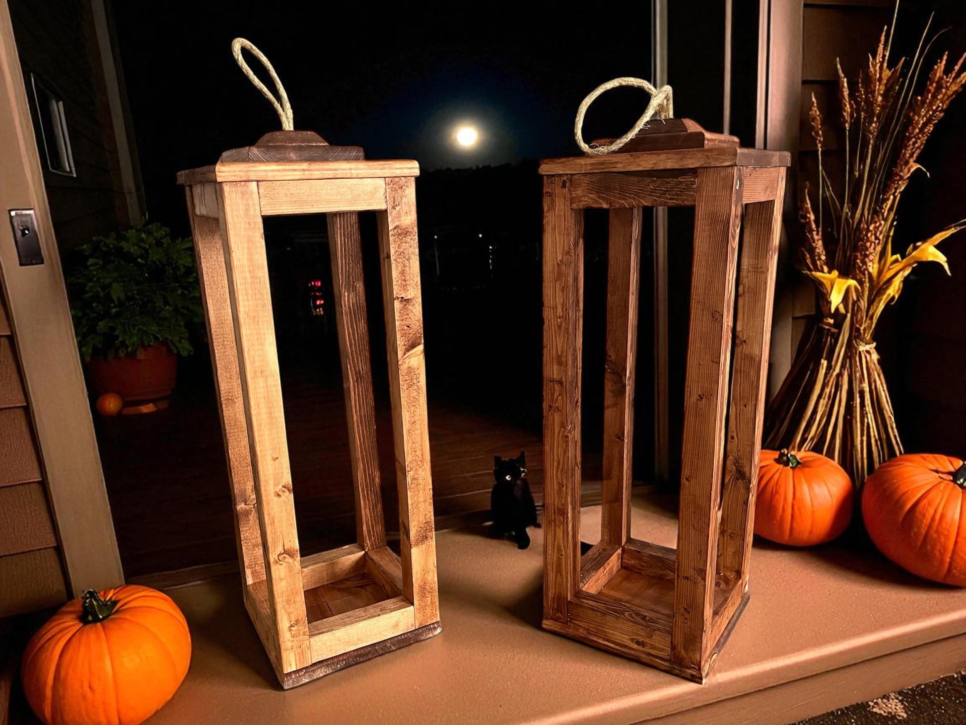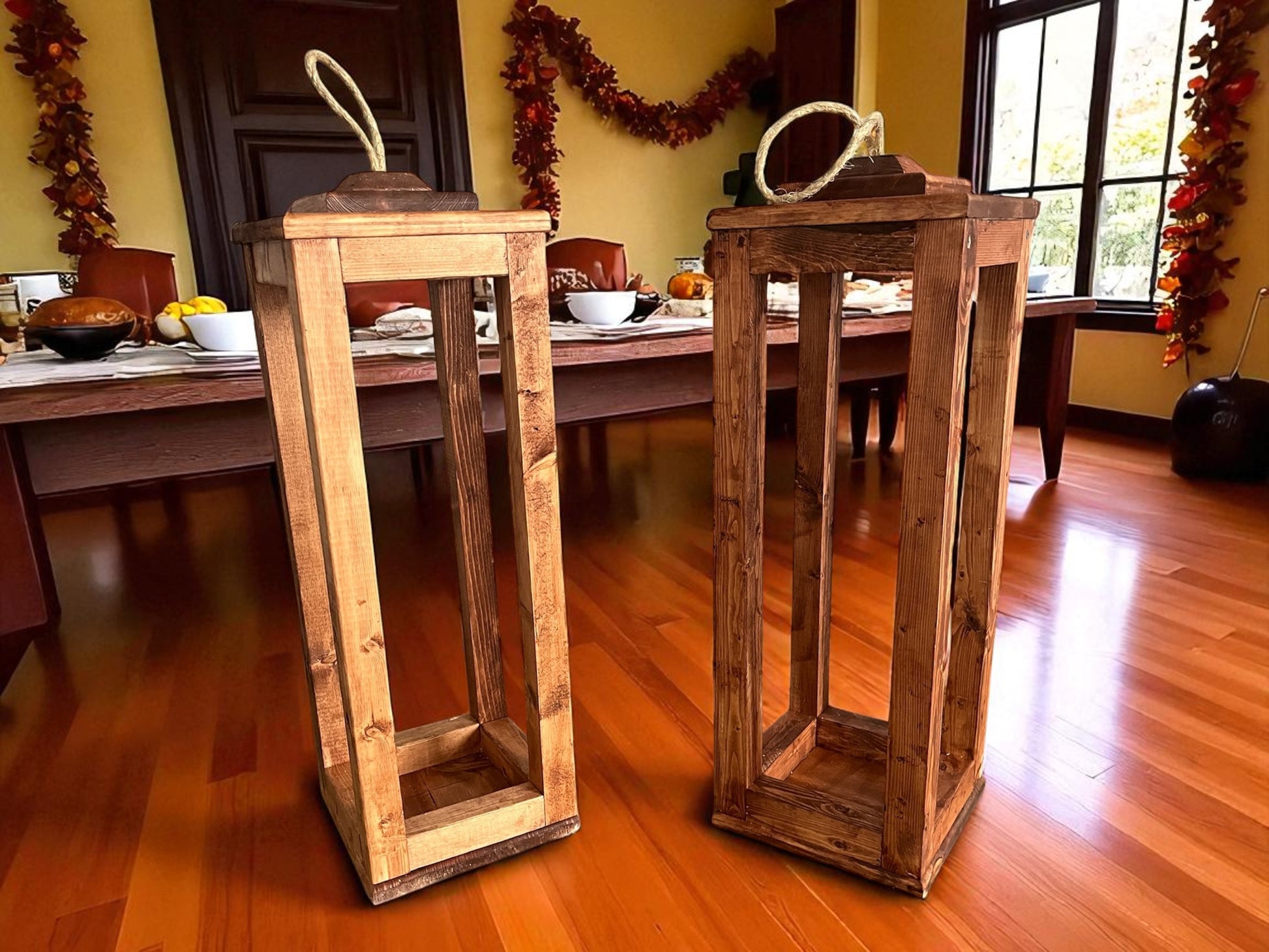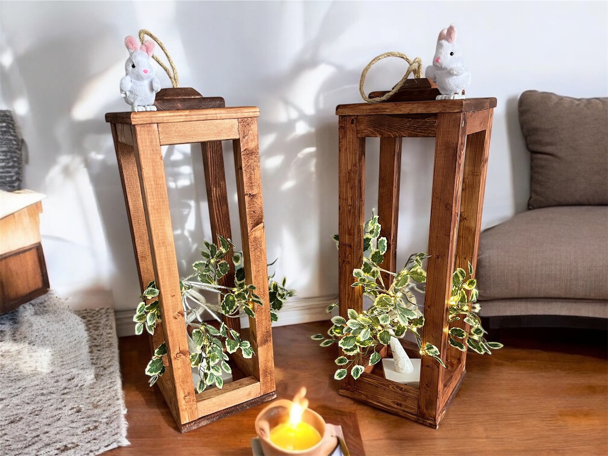 Add a touch of handcrafted beauty to your space with this extra-large 2-foot rustic wooden lantern, thoughtfully designed to enhance both indoor and outdoor settings. Whether you're decorating for the season or looking for that perfect farmhouse statement piece, this lantern is the ideal blend of charm and durability. Weighing approximately 6 pounds per unit it is hangable, or place on the ground. Designed and built to teach woodworking to our daughter. She helps in the building of each one, Although dad does the saw work for safety. BUNNY'S AND LIGHTED TREES ARE NOT INCLUDED.