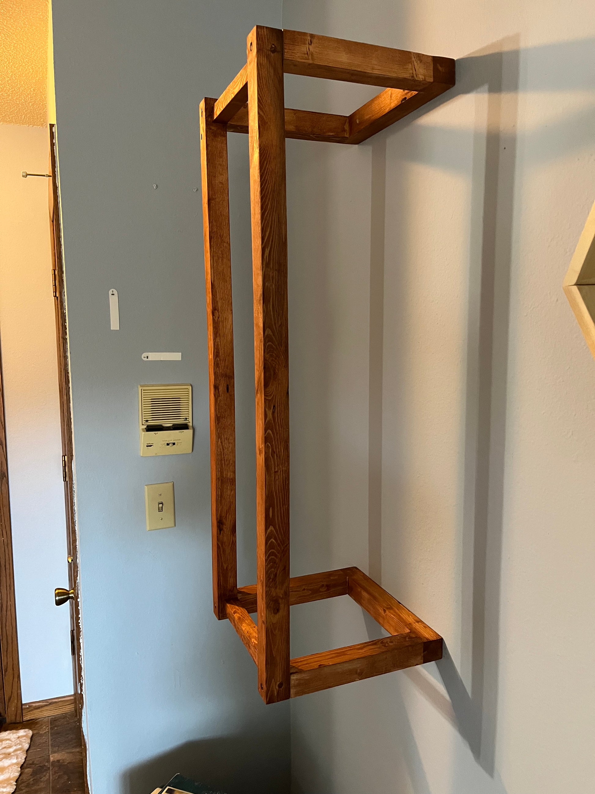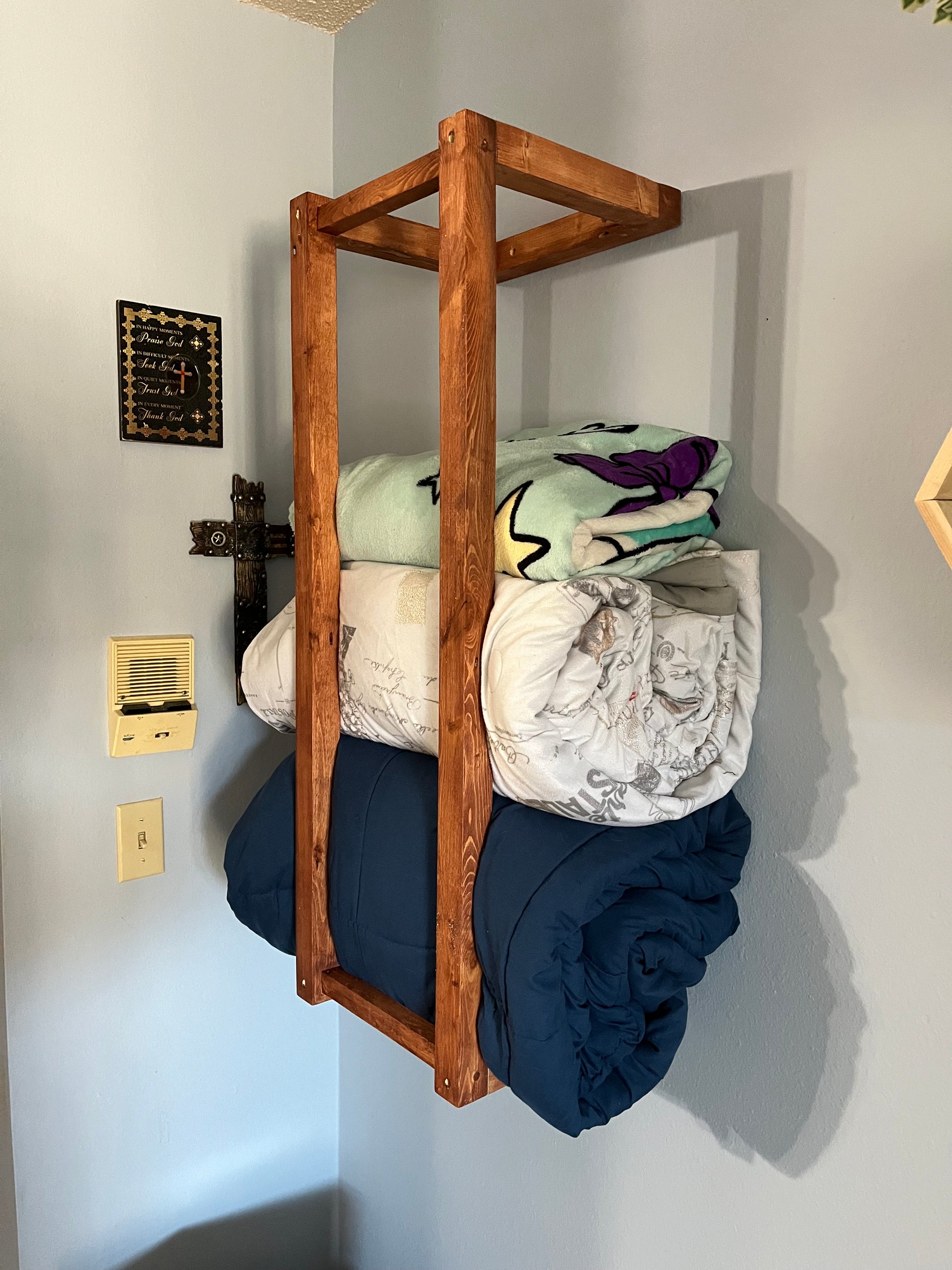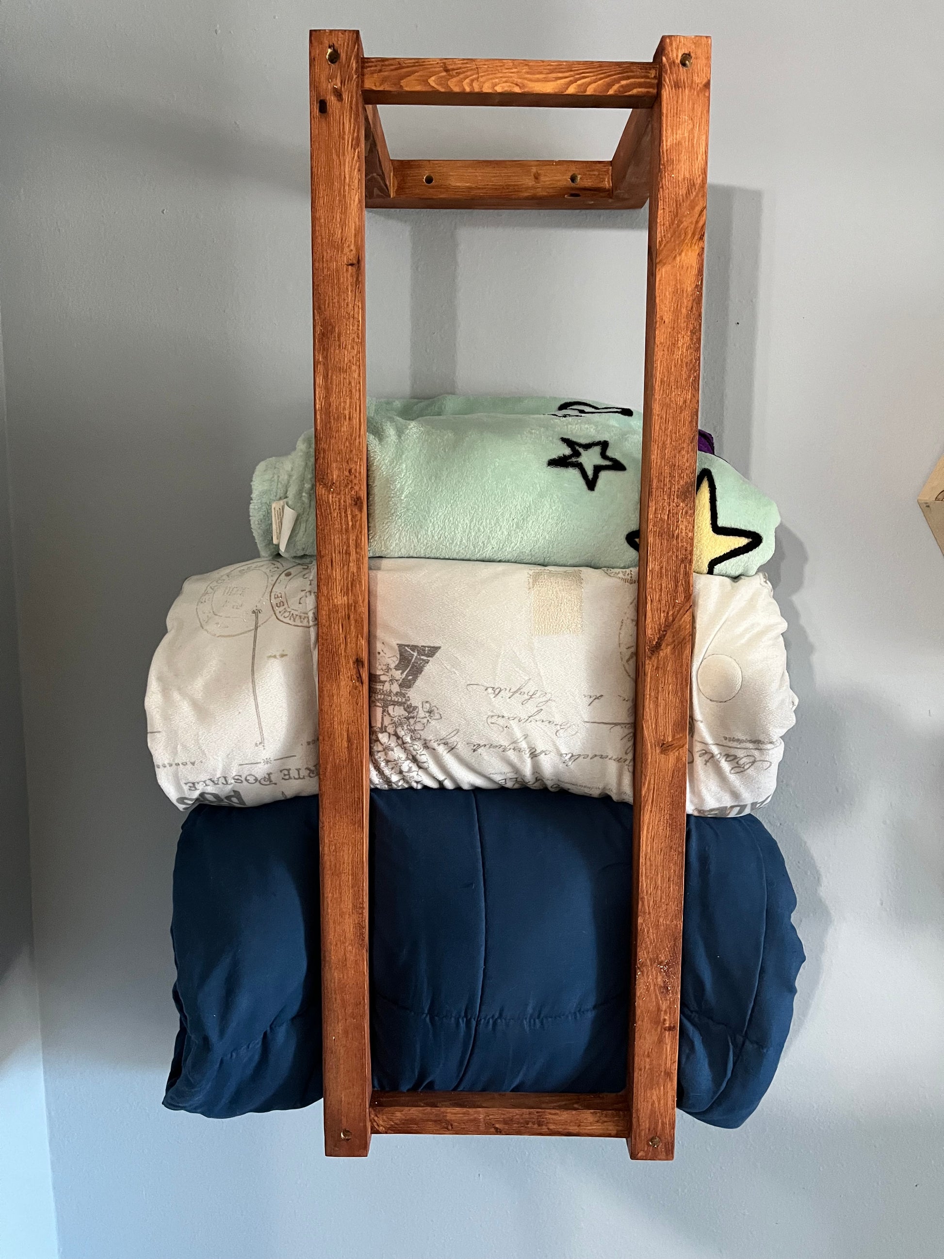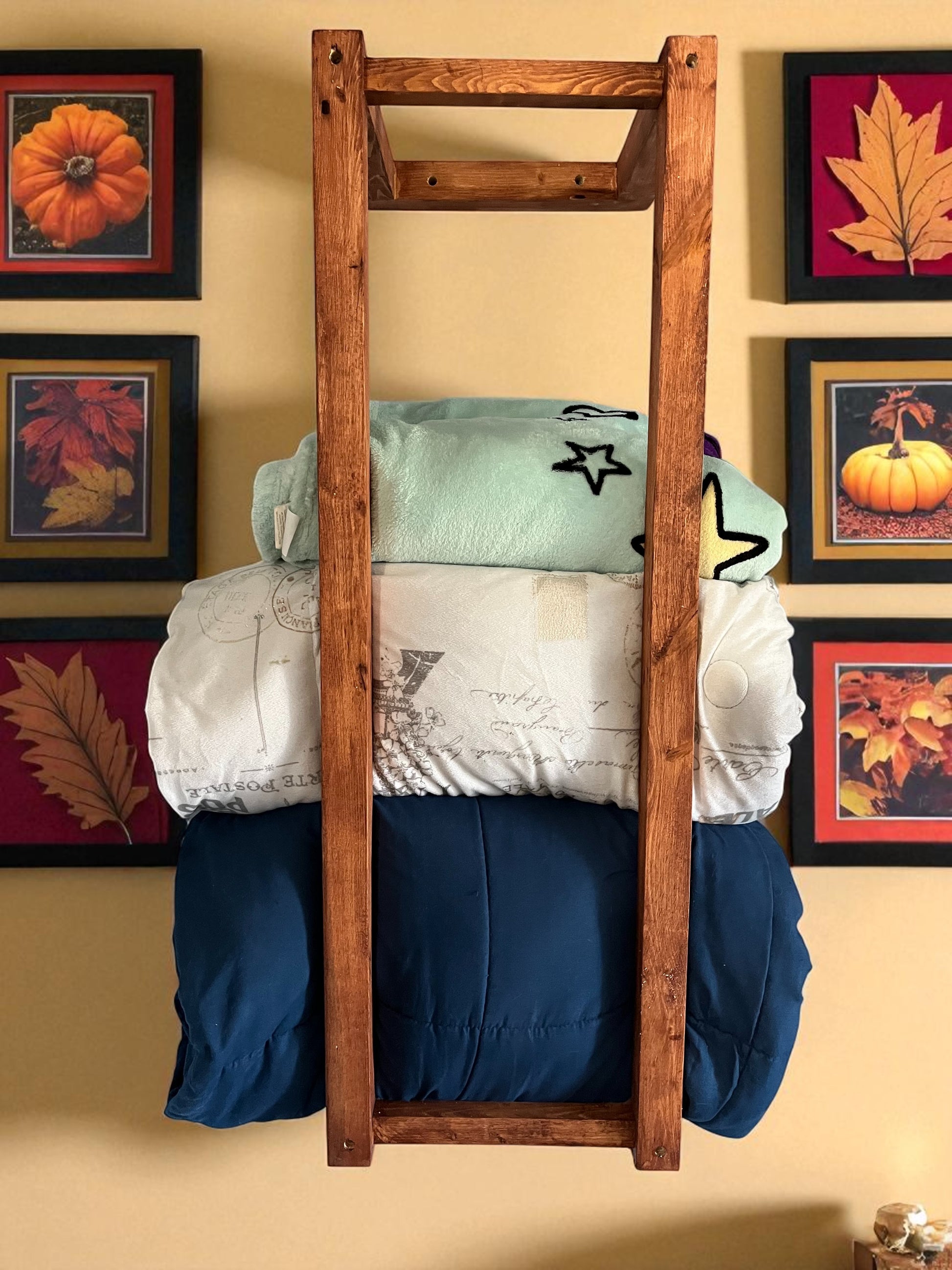 Bring rustic charm and practical storage to your space with this Handmade Wall-Mounted Wooden Blanket Rack. Crafted from solid wood and finished with a rich, warm stain, this vertical frame adds a touch of farmhouse elegance to any bathroom, laundry room, or entryway.