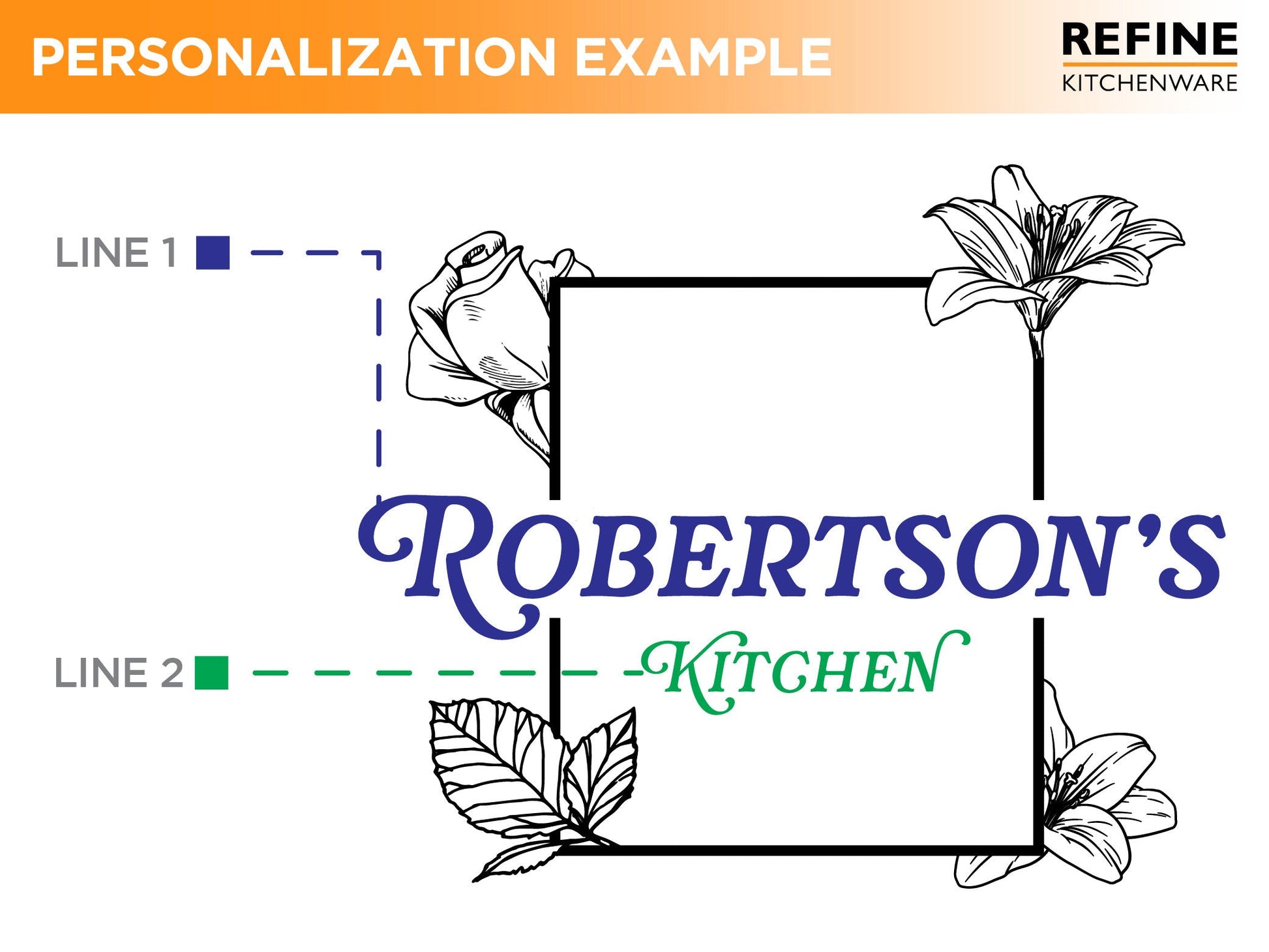 ā¶ Enter the text exactly as you would like it engraved. Example: "Katie's Kitchen" or "Mom's Kitchen" Please include any additional instructions if you require them. Any text not included will not be on the engraving.