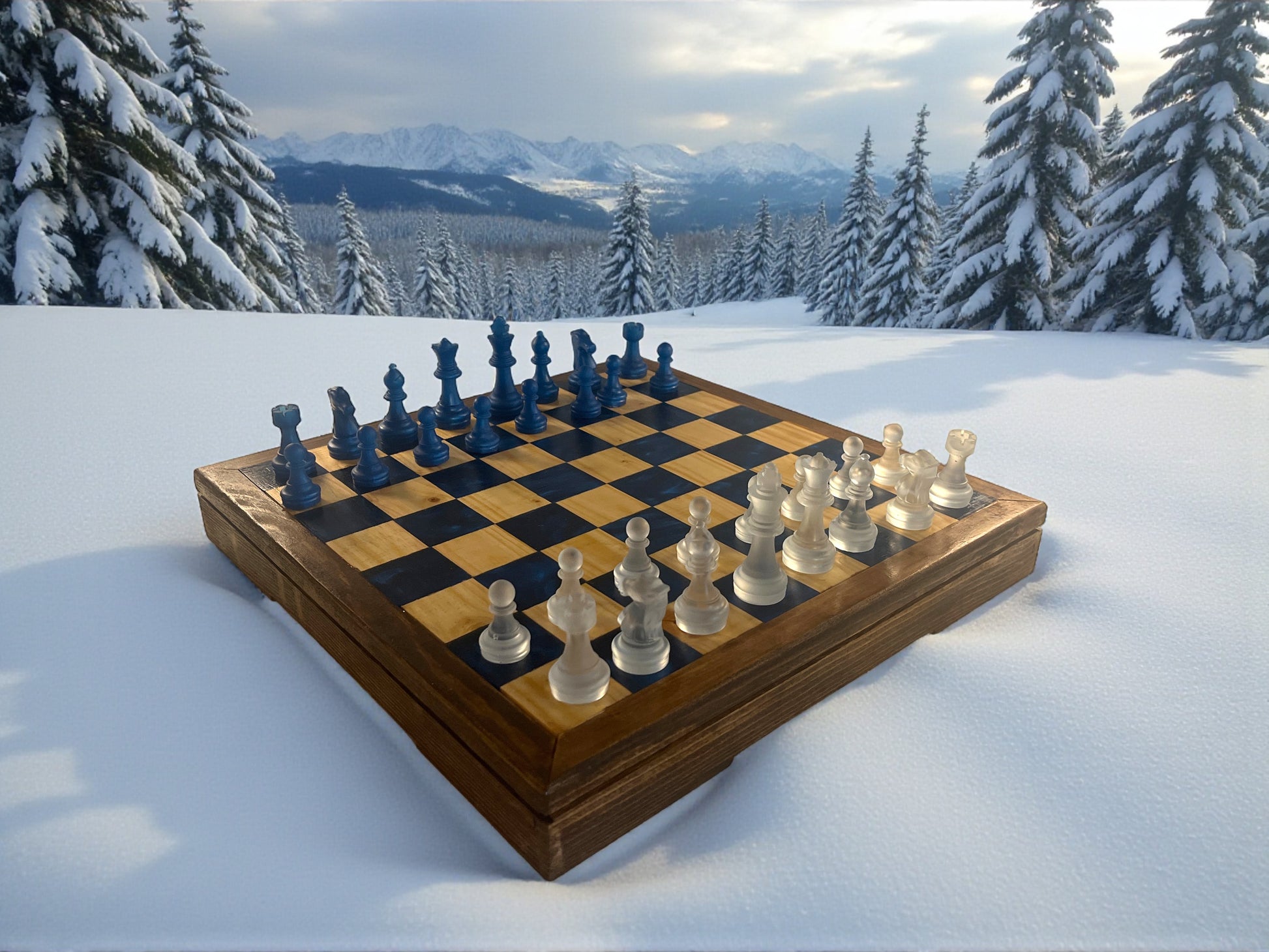 Bring warmth, craftsmanship, and elegance to your game nights with this Rustic Wood & Resin Chess Set. Designed to look right at home in a cozy cabin or stylish modern living space, this handcrafted board blends rich natural wood with deep navy resin squares for a striking, timeless finish. The frosted white and navy chess pieces add a sophisticated contrast, creating a board that’s as beautiful to display as it is enjoyable to play on.